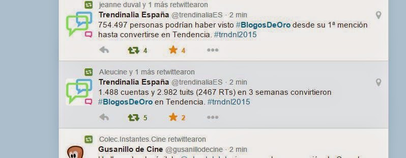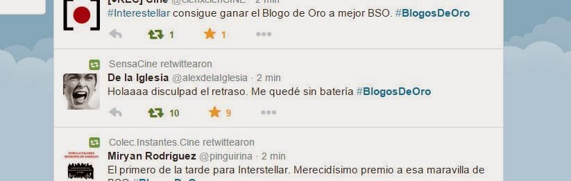 Como digo, esa era la base de todo el tinglado, sin embargo, todos queremos evolucionar y llegar siempre lo más lejos posible y, en la tarde de ayer, había un reto en el aire ¿seríamos capaces de hacer que el hastag #BlogosDeOro llegase a ser Trending Topic en Twitter? Algunos como Rudy, de Motel Purgatorio, nunca tuvieron dudas, otros eran (éramos) más escépticos. Ese era uno de los más ansiados objetivos, y vaya si lo conseguimos.También cuenta la leyenda que a Rudy, de Motel Purgatorio, se le borró el F5 del teclado de tanto actualizar la página para comprobar si subíamos en los Trending Topic, que a Javi de Cine De Patio se le rompió un dedo intentando contactar con Alex De La Iglesia que no aparecía y que a Lorena alias Delorian Gray de Calle Baker se la vio correr, cual loca desquiciada, por las plantas de un hospital buscando conexión Wifi como si le fuera la vida en ello. Entre tanto, Enoch de Ravenheart, Miryam de Los Guiltys de Pinguirina y Alfie de NewCinema intentaban poner calma y cordura entre los presentadores.