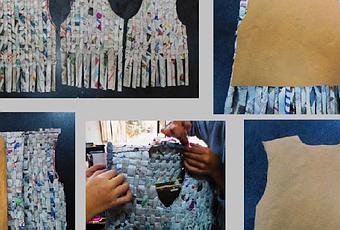 - Corté los moldes de acuerdo con las medidas tomadas y dibujé en el tejido para recortar, y unir las piezas.- En los bordes del cuello y brazos se puso papel maché con goma. - Se quitaron unos palos de periódico para hacer los flecos.