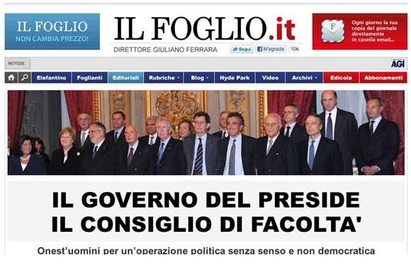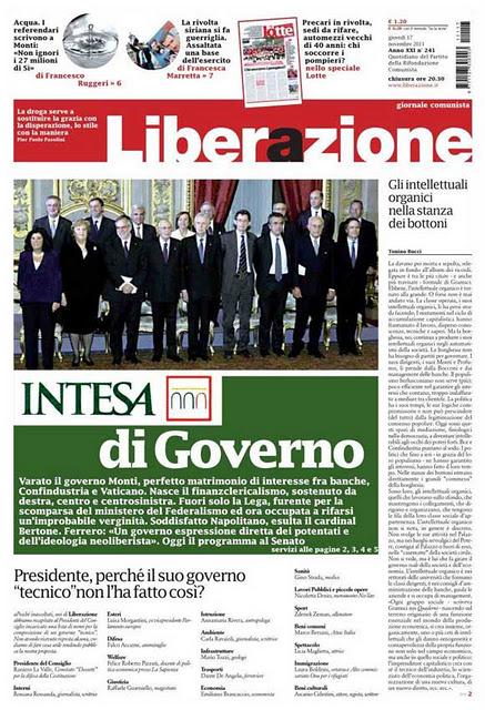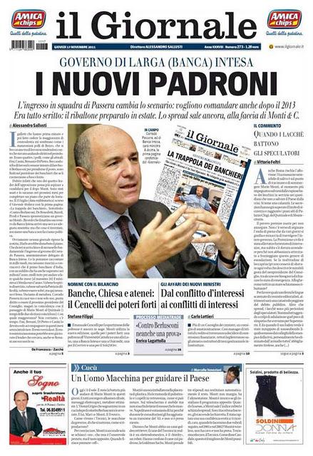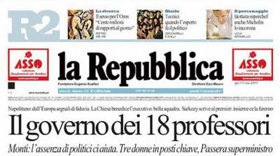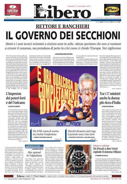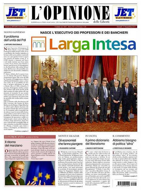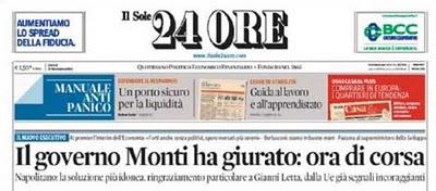 Estaba preparando una entrada aquí, con las portadas de los diarios italianos, curiosamente unánimes en destacar tres tendencias del gobierno tecnócrata que -sin ser elegido por el parlamento, y aún sin programa concreto definido-, ha sido puesto por el profesor Monti, designado por el presidente de la república italiana, al margen del parlamento: