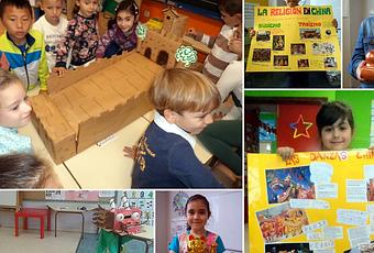 Un trocito de muralla y un dragón elaborados por las mamás de la clase de al lado, Álvaro nos ha traído un Buda para nuestra exposición, Leonor el famoso gato chino de la suerte y Daniela un gran mural sobre las danzas típicas: la del dragón y el león.