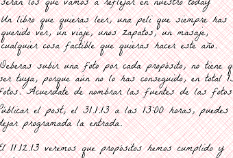 Cambian un poco las instrucciones, ya que este today consistirá en escribir 13 propósitos que queremos cumplir este año, y a fecha de 11.12.13 (today retorno) comprobaremos cuántos hemos cumplido y en qué medida.