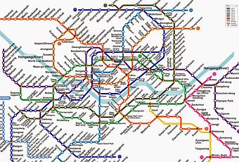 Viéndolo así parece un infierno, pero vengo de Tokyo donde tienen 3 planos de tren como este para cada una de sus compañías o sea que no me parece para nada complicado, (solo hay que mirar en el centro donde está "Seoul Station" que es por donde más estaré. También estuve mirando trenes desde el aeropuerto, por lo visto está la linea KTX que nos lleva directamente hasta Seoul Sta. en unos 45 minutos... y por solo 8000Won!! (espera eso suena mucho) en Yens no son ni 800 miseros yens, y si hablamos en euros serían unos 5€. Por cierto, bajo todo pronostico al final conseguí guía privada para el sábado... ¡y es mi querida KON-CHAN! El sábado nos guiará por la ciudad y nos llevará a comer a buenos restaurantes coreanos... O sea que no solo iré a Corea si no que podré volver a ver a una vieja amiga y compañera de clase ^_^. Ya dije que siempre cuando pasan cosas malas realmente también vienen acompañadas de cosas buenas.