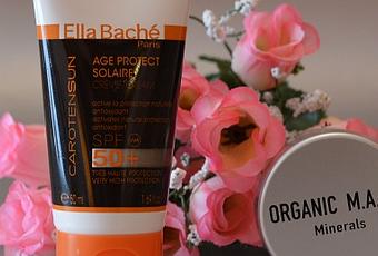 Quería prepararme una “BB cream” para el verano, así que para mí lo básico era una alta protección solar. Además quería que tuviese también algo de propiedades antiedad. Por eso aposté por la crema de protección solar antiedad “Carotensun Age Protect Solaire SPF50+” de ELLA BACHÉ y la mezclé con la base de maquillaje mineral de ORGANIC M.A.K.E. He conseguido una crema protectora con color, que además me ofrece una función más, es decir la antiedad. Con mi “BB cream” tengo asegurada la protección y tratamiento durante el día con efecto maquillaje. A continuación os presento ambos productos utilizados.