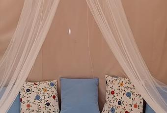 Tenía yo en casa una camita plegable que compré hace algunos años en Ikea, la habré usado tres o cuatro veces, así que se me ocurrió ponerla en el patio para que mis hijas lean, vean pelis, descansen... Pero claro, no iba yo a poner la camita ahí sola...