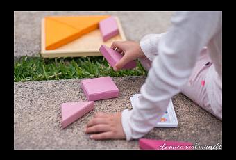 Es un Tangram excelente en todos sus detalles, incluso en los colores que siguen una misma gama cromática (lee más información sobre los colores aquí). Ya sea a modo de juego libre o con el cuadernillo de láminas propuestas es un reto muy divertido y estimulante para los más pequeños, que desde los 3 años ya pueden experimentar con este material.