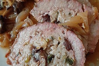 Precalentar el horno a 200ºC. Cuando el horno esté caliente, poner la pieza rellena en el horno, bajar la temperatura a 180ºC y cocinar durante 40 minutos, añadir la guarnición elegida, en mi caso he puesto cebolla laminada y champiñones, bajar la temperatura a 160ºC y hornear durane 30 minutos más.