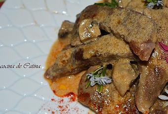 Agregamos los champiñones, la cayena fresca picada y continuamos pochando unos 5 minutos mas. Añadimos la nata y el agua, llevamos a ebullición, dejamos reducir unos minutos y ponemos a punto de sal y pimienta.