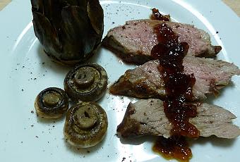 Sella la carne en una plancha (vuelta y vuelta), salpimenta, añade un poco de romero y coloca en otra fuente. Hornea a 200ºC durante 25 minutos. Por otro lado, limpia las alcachofas, cortando un poco del culo y retirando la primera capa de hojas. Coge por el culo y golpéalas contra la encimera para que se abran un poco. En el interior añade pimienta, sal, unas gotas de limón y un chorrito de aceite. Corta el tronco de los champiñones, lava y salpimenta. Coloca las verduritas en una bandeja, añade un chorrito de aceite por encima y hornea unos 15 minutos a 200 C. Lo puedes hacer a la vez, primero introduces la carne y a los 10 minutos las verduras, así aprovechas la energía del horno y lo podrás servir todo calentito. Bon profit!