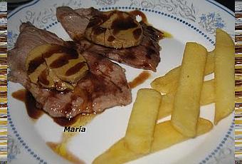 -Ponemos los medallones de fua y les damos vuelta y vuelta y colocamos sobre los filetes-Emplatamos y servimos con sal de maldon y patatas fritas.