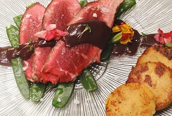 Disponemos una cama con los tirabeques, sobre ella 3 lonchas de la presa ibérica. Napamos con la salsa de vino tinto trazando una línea sobre el plato. Colocamos 3 medallones de polenta al romero y chalota en un lado y terminamos decorando con unas flores comestibles (muy del campo), un poco de eruca picante (que nos dará matices de nuez) y un poco de sal en escamas.