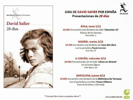 Esta semana tendrá lugar la presentación del nuevo libro de David Safier, 28 Días, en varias ciudades españolas. En concreto, esta tarde estará en Madrid, en la Casa del Libro de Gran Vía, 29, charlando con la periodista Paula Corroto. Otras ciudades donde se le podrá ver serán La Coruña y Barcelona.
