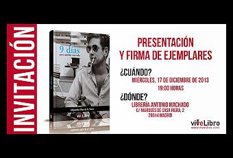 Vivelibro te invita el próximo MARTES 17 DE DICIEMBRE A LAS 19´00h., en la Librería Antonio Machado, C/ Marqués de Casa Riera, 2. 28014 Madrid, a la presentación del libro "9 días para cambiar una vida", de Alejandro Díaz de la Torre, una novela dulce, sensible, implacable con la corrupción y tierna con el género humano. El joven Alejandro invita a su amigo Dalet a pasar las fiestas de otoño en Madrid con sus familiares. Ambos son Tangorys y estudian en California. Alejandro, por orden de su padre, un eminente hombre del pueblo de Tangor, se encarga de esclarecer las razones por las cuales Dalet es asesinado en un club de alterne del municipio de Aranjuez.