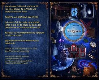 A quienes le gusten los libros fantásticos, el Viernes 28 de este mes tengan un ratito libre por la tarde y además se encuentren cerca de San Vicente del Raspeig, pueden disfrutar de la presentación del libro "Félgora y la antesala del olvido", escrito por C. G. Bernabé, y editado por la Editorial Appaloosa.Aquí os dejo los datos: