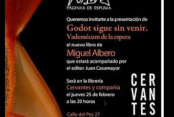 Esta tarde, a las 20 horas, tendrá lugar la presentación del ensayo Godot sigue sin venir: Vademécum de la espera, del autor Miguel Albero. Será en la librería Cervantes y Cía (C/ del Pez, 27 de Madrid). El autor estará acompañado por el editor de Paginas de Espuma, Juan Casamayor.
