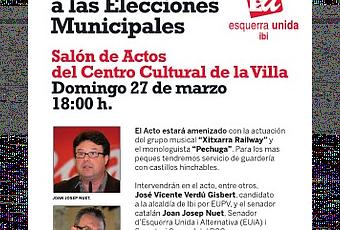 En el colectivo ibense de EUPV ya tenemos confeccionada nuestra lista electoral y hemos organizado el acto de presentación para el próximo Domingo, 27 de marzo, a las 18,00 horas, en el Salón de Actos del Centro Cultural de la Villa.