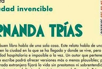 Esta tarde, a las 20 horas en la Librería Iberoamericana (C/ Huertas, 40) tendrá lugar la presentación del libro de Fernanda Trías La Ciudad Invencible, publicado por la Editorial Demipage. En el acto, la autora estará acompañada de la escritora Mercedes Cebrián.