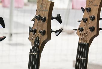 Dos jazz bass activos, uno de 5 cuerdas, cuerpo de caoba con tapa de Koa y diapasón de palorrosa con pastillas Lindy Fralin y previo Aguilar de 3 bandas.