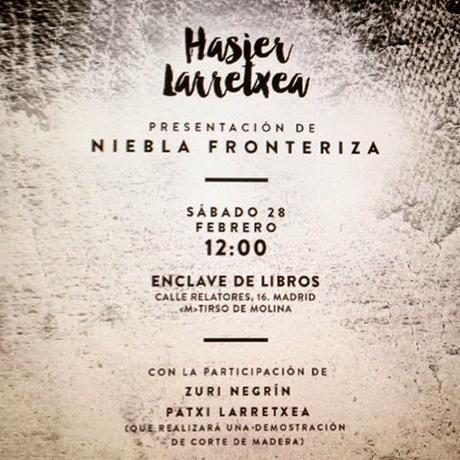 Hoy sábado, a las 12 horas, tendrá lugar la presentación del nuevo libro de poemas de Hasier Larretxea, titulado Niebla Fronteriza. Será en Enclave de Libros (C/ Relatores, 16). Participarán Zuri Negrín y Patxi Larretxea.