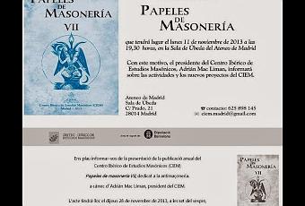 Los días 11 y 28 de Noviembre tendrá lugar la presentación en Madrid y Barcelona de la revista “Papeles de Masonería VII” monográfico dedicado a la “antimasonería”.