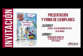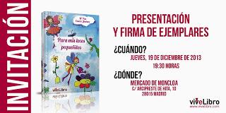 Vivelibro te invita el próximo JUEVES 19 DE DICIEMBRE A LAS 19´30h., en el Mercado de Moncloa, C/ Arcipreste de Hita, 10. 28015 Madrid, a la presentación del libro de cuentos "Para mis locos pequeñitos, la fantasía continúa", de María Paz Casero. Nuestra autora nació en Mota del Cuervo (Cuenca), en 1955, reside en Madrid y tiene 3 hijos y 2 nietas mellizas. Empieza a escribir hace unos años pensando en ellos y en la posibilidad de llegar a los más pequeños con problemas de salud. Su libro contiene cuatro cuentos con características propias.