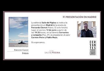 Esta tarde, a partir de las 19.30 horas, tendrá lugar en la librería Cervantes y Compañía (C/ del Pez, 27 de Madrid) la presentación del nuevo libro de Fernando Clemot, Polaris. El autor estará acompañado por la escritora Carmen Peire y por el escritor de Salto de Página Pablo Mazo.