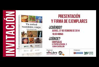 Este jueves, 27 de febrero, a las 19h. se presenta en la Cooperativa Salus (C/ Pintor Vergara, 3. 12004 Castellón), el libro "Tu salud también viaja", de Marián Borja Prado. Brasil, Kenia, Guatemala o la India, reciben cada año millones de turistas de todo el mundo.