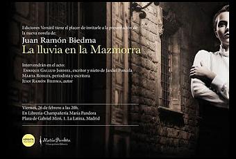 Esta tarde, a las 20 horas, Ediciones Versátiles publicará el nuevo libro de Juan Ramón Biedma, La Lluvia en la Mazmorra. Tendrá lugar en la champañería librería María Pandora (Plaza de Gabriel Miró, 1). El autor estará acompañado por el escritor Enrique Gallud Jardiel y la periodista Marta Robles.