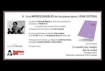 Mañana 3 de octubre, en la librería Vergüenza Ajena (C/ Galileo, 56), tendrá lugar la presentación de la antología poética de Jean Cocteau La Mentira que siempre dice la Verdad, editada por Salto de Página. Participarán Antonio Rómar, Jordi Corominas y Arturo Martí.