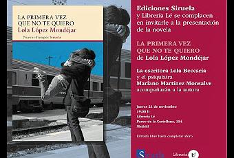 Esta tarde, a las 19 horas, en la Librería Lé (Paseo de la Castellana, 154 de Madrid) tendrá lugar la presentación del libro de Lola López Mondéjar La primera vez que no te quiero, editado por Siruela. La autora está acompañada por la escritora Lola Beccaría y el psiquiatra Mariano Martínez Monsalve. La entrada es libre hasta completar aforo.