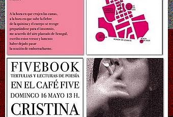 Siguiendo con el ciclo de lecturas que ha organizado el poeta y periodista José Antonio Martínez Muñoz, y por el que ya han pasado Ramon Dachs, Sebastián Mondéjar y María Auxiliadora Álvarez, este domingo tendremos el inmenso placer de poder escuchar los nuevos poemas que la editorial 'La bella varsovia' le ha publicado a Cristina Morano. Ya saben la cita es este domingo 16 de mayo, a las 13h. en el Café Five.