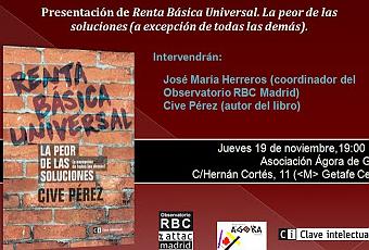 Presentación del libro Renta Básica Universal. La peor de las soluciones (a excepción de todas las demás) Asociación Ágora de Getafe. Jueves, 19 de noviembre, 19,00 hC/ Hernán Cortés, 11 Getafe Central