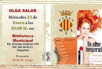 Empezamos con la presentación de Olga Salary su última novela en papel, Un amor inesperado. La autora acudirá a la Biblioteca Municipal de Sagunto (al lado de Valencia) el miércoles 23 de enero a las ocho.