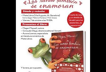 ~ Dentro de dos días, el 7 de octubre, tendrá lugar la presentación, en Barcelona, de la nueva novela de Megan Maxwell, Las ranas también se enamoran, a las 19 horas. No os lo podéis perder, yo seguro que no lo hago.