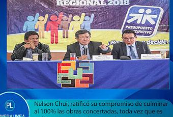 Gobernador regional de Lima – Nelson Chui, mostró las propuestas para el presupuesto participativo 2018Una cartera de 53 proyectos de inversión pública propuesta para el Presupuesto Participativo Regional 2018, durante la segunda sesión del Consejo de Coordinación Regional (CCR) – presentó el Gobierno Regional de Lima (GORE LIMA).El titular del pliego Nelson Chui Mejía – tras tomar juramento a los nuevos miembros del CCR integrado por cinco alcaldes de los distritos de Arahuay (Canta), Pacaraos, Atavillos Alto (Huaral), Leoncio Prado (Huaura) y San Mateo de Otao (Huarochirí); así como nueve representantes de la sociedad civil, informó que se trabajará en base al presupuesto que se reciba del Ejecutivo y que para incluir los proyectos al programa de inversión multianual deberá tener como unidad ejecutora a la entidad regional.En ese sentido- se explicó que la cartera de proyectos será sumada al aporte que realicen los alcaldes provinciales en su calidad de presidentes de Consejo de Coordinación Local (CCL), para que finalmente sean sometidos a su priorización en los talleres regionales para la zona Norte (Huaura) y Sur (Cañete), que tendrán lugar los días 30 de mayo y 1 de junio del presente año.