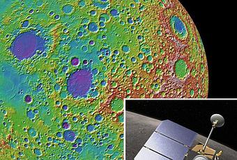 Un instrumento láser a bordo del orbitador lunar de la NASA (recuadro) ha elaborado un nuevo mapa topográfico de cráteres de la luna. Crédito: Science/AAAS; (Inset) NASA