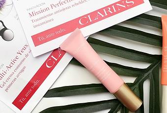 Se trata de Multi-Active Yeux, un gel-crema especialmente indicado para las primeras arrugas de la zona del contorno de ojos enriquecido con pigmentos “luminosidad” para aparte de descongestionar la zona, iluminarla.Mientras que Mission Perfection Yeux SPF 15 es un antiojeras que promete actuar hasta con las más rebeldes y pigmentadas, gracias al efecto de La escina de la castaña de Indias que protege la microcirculación y el extracto de acerola, que asociado a un derivado de vitamina C, reduce la sobreproducción de pigmentos de melanina.También ejerce una acción correctora frente a las ojeras gracias al complejo “High-Lumitech”, una combinación de pigmentos reflectores de la luz, que compensa ópticamente todos los colores de las ojeras recuperando la luminosidad de la mirada.Y con el fin de limitar el oscurecimiento del contorno de ojos protegiendo la piel de la zona de los rayos UV y la contaminación con filtros 100% minerales (SPF 15) y a un complejo anticontaminación exclusivo de Clarins