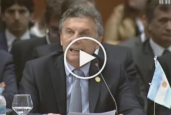 El presidente de Argentina, Mauricio Macri, durante su intervención en la reunión de jefes de estado del Mercosur, pidió reforzar la democracia en la región y la liberación de los presos políticos en Venezuela.