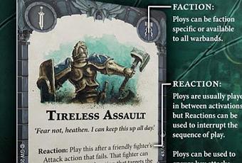 Cada imagen es de una carta de ejemplo, con explicaciones en inglés de lo que hace y para que sirve en las mecánicas del juego. En total, ha colgado 4, todas al parecer de la caja básica: Una de estratagemas, dos de personaje (Una carta de los chicos de Sigmar,otra de los chicos de Khorne) y una de objetivo.