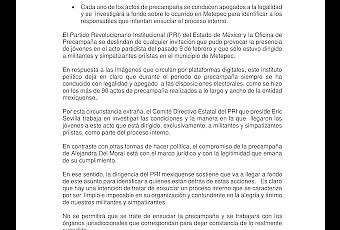 En respuesta a las imágenes que circulan por plataformas digitales, este instituto político deja en claro que durante el periodo de precampaña siempre se ha conducido con legalidad y apegado a las disposiciones electorales, como se hizo en los más de 90 actos de precampaña realizados a lo largo y ancho de la entidad mexiquense.
