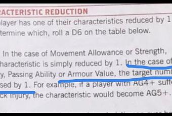 El caso es que, y de nuevo gracias a BattleTricks, se ha descubierto entre esas filtraciones lo que parece ser una de las primeras erratas que contiene el manual...sin haberlo publicado!! Está subrayado y no hace falta saber mucho inglés para ver que eso es un gazapo tremendo: Como que si un jugador sufre por ejemplo el resultado de "Lesión de Cuello" su AG sube un punto!!??. Y eso que el encabezado habla directamente de "Reducción de Características".