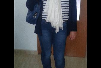 Blusa a rayas marinera de Zara (25€), ideal y que pega con todo. Esta vez combinada con unos vaqueros de Blanco (18€) elásticos y muy cómodos que además me sientan de miedo jajaja. Con una chaqueta Azul marino de Esfera que me regalaron en mi cumple y que es perfecta para esta época del año por esta zona, ya que, por el día va en el bolso pero por la tarde- noche refresca y hay que rescatarla.