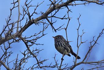 A este ejemplar lo vi el 3 de septiembre entre unos árboles espinosos en el terraplén por donde hasta hace 50 años pasaba el ya desaparecido ferrocarril de trocha angosta (del que ni los rieles quedaron) cerca de una de sus estaciones: Francisco A. Berra. Lo vi de casualidad mientras esperaba que aparecieran unos espinero pecho manchado que tenían su nido en ese sitio, en principio me pareció ser un piojito común (Serpophaga subcristata) pero enseguida vi su plumaje barrado y me di cuenta que era un cachudito, no sabía cual, por fortuna fue el pico amarillo que nunca había visto, el otro, el pico negro ya lo tenía visto y fotografiado, además después de consultar bibliografía supe que no es esperable en esta zona. Tuve suerte con este pajarito porque se dirigió más o menos en mi dirección, volando y saltando entre las ramas en busca de pequeños insectos; estaba muy enramado y difícil de fotografiar, incluso de observar pero al menos le pude hacer algunas fotos antes que se perdiera entre uno árboles más lejanos.