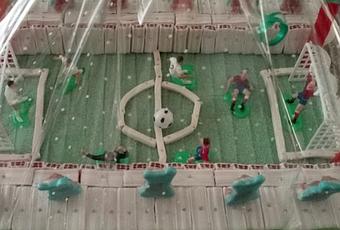 Primero, un campo de fútbol para regalar a mi sobrino, por eso iba bien envuelto, pero me lo llevé porque me ayudaría a decorar la mesa dulce.