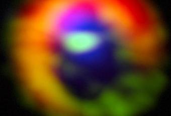 El polvo en la zona más exterior del anillo se muestra en rojo. La zona con gas más denso está en verde, mientras que los gases más diluidos son de color azul.