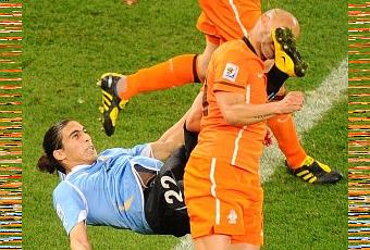 En el minuto 22 se ve una de las más espectaculares y duras faltas del mundial. Cáceres intenta una chilena lejana y su bota impacta con la cara de De Zeeuw. Antes había pasado desapercibida una entrada con los tacos del desaparecido Van Bommel. Adivinen quien acaba llevándose una tarjeta... Sneijder, que pasaba por allí a protestar. Raro. El partido, inexplicablemente se vuelve demasiado crudo y hasta el minuto 34 no funciona sino a base de faltas. Diez minutos perdidos de fútbol en una semifinal de un Mundial... El árbitro es de Uzbekistan. En serio. Estando fuera del mundial Francia, Inglaterra, Italia, Argentina y Brasil, ¿por que no un árbitro de éstos países con larga tradición futbolística?