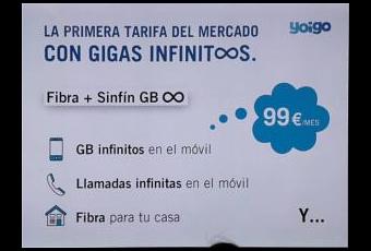 Yoigo denomina a la tarifa Fibra + la Sinfín con GB infinitos. Esta oferta incluye llamadas ilimitadas en el móvil y datos ilimitados en el móvil. Ofrece fibra en casa de hasta
