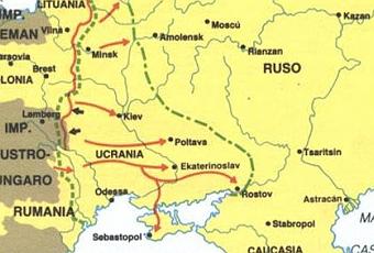 El Gobierno obrero y campesino instituido por la revolución del 24-25 de octubre (6-7 de noviembre) y apoyándose en los soviets de diputados-obreros, soldados y campesinos, propone a todos los pueblos en guerra y a sus gobiernos entablar inmediatamente conversaciones con vistas a una paz democrática equitativa. El gobierno considera como una paz equitativa o democrática, tal como la desea la inmensa mayoría de los obreros y las clases trabajadoras, agotadas, abrumadas y martirizadas por la guerra en todos los países beligerantes, paz que los obreros y los campesinos rusos, han reclamado de la manera más categórica y tenaz desde el derrocamiento de la monarquía zarista, una paz inmediata sin anexiones (es decir, sin conquistas de territorios extranjeros, sin la incorporación violenta de pueblos extranjeros por la fuerza) ni intimidaciones. El Gobierno invita a todos los gobiernos y los pueblos de todos los países en guerra a concertar inmediatamente un armisticio; considera deseable que este armisticio sea de tres meses por los menos, Fragmentos de la Declaración del Congreso de los Soviets de toda Rusia a los pueblos y gobiernos de todos los países beligerantes. Petrogrado, 25 de Octubre de 1917 Las negociaciones que Rusia comenzó con Alemania se atascaron debido a las exigencias alemanas que parecieron desmesuradas a Rusia. Los alemanes , como respuesta, llevaron acabo una gran ofensiva (febrero, 1918) que hizo retroceder muchos kms. a los rusos en todas las partes del frente como se ve en el siguiente mapa: