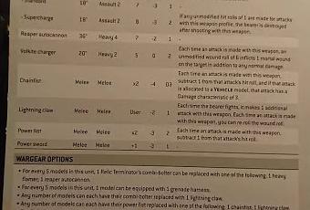 Son algunas páginas sueltas, a modo de curiosidad, mostrando algunas unidades y sus reglas. Y la verdad es que se ven cosas raras, como por ejemplo en la primera, mezclar en un solo tipo de unidad los Relic Terminators...es decir, los Exterminadores con modelos Tártaro y Catafracto de armadura, amalgamados en una sola unidad (No tiene sentido, al ser originalmente dos modelos diferentes y empezando por las reglas!) o que los Ángeles Sangrientos, y sucesores, no tengan Anciano del Capítulo (Portaestandarte del Capítulo).