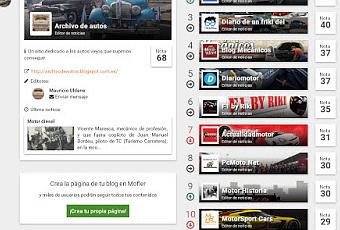 Archivo de autos, como editor de noticias, se encuentra en primer lugar en el ranking de la red social del motor, Mofler. Lo más interesante que detrás está un sitio de noticias del mundo automotor de España, Motor.es. En lo personal lo considero un gran logro, ya que Archivo de autos no cuenta con un equipo de profesionales para investigar, escribir y editar las notas que publico a diario. Es un sitio donde detrás solo está la persona que firma estas líneas. Por eso es importante, no solo para mí, sino para este sitio que se dedica a los viejos autos que supimos conseguir. Simplemente quería que los seguidores/lectores de Archivo de autos lo supieran. http://mofler.com/archivodeautos Mauricio UldaneAutor y editor de Archivo de autos