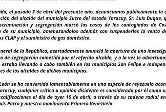 En tal sentido, el pasado 7 de abril del presente año, denunciamos públicamente la aberrante y criminal acción del Alcalde del municipio Sucre del estado Yaracuy, Sr Luis Duque, quien en un acto de discriminación y segregación marcó las casas de los contagiados de Covid19 en la jurisdicción de su municipio, amenazandolos además con suspenderles la venta de comida a través de los CLAP y el suministro de gas doméstico.